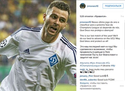 Нападающий киевского «Динамо» Жуниор Мораес с нетерпением ждет заключительный матч года против «Маккаби». Об этом бразилец сообщил на своей странице в Instagram.