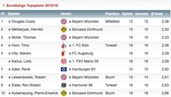 Дуглас Коста получил среднюю оценку 2,38, Генрих Мхитарян набрал средний балл 2,50. Третьим с оценкой 2,53 стал нападающий «Баварии» Томас Мюллер.