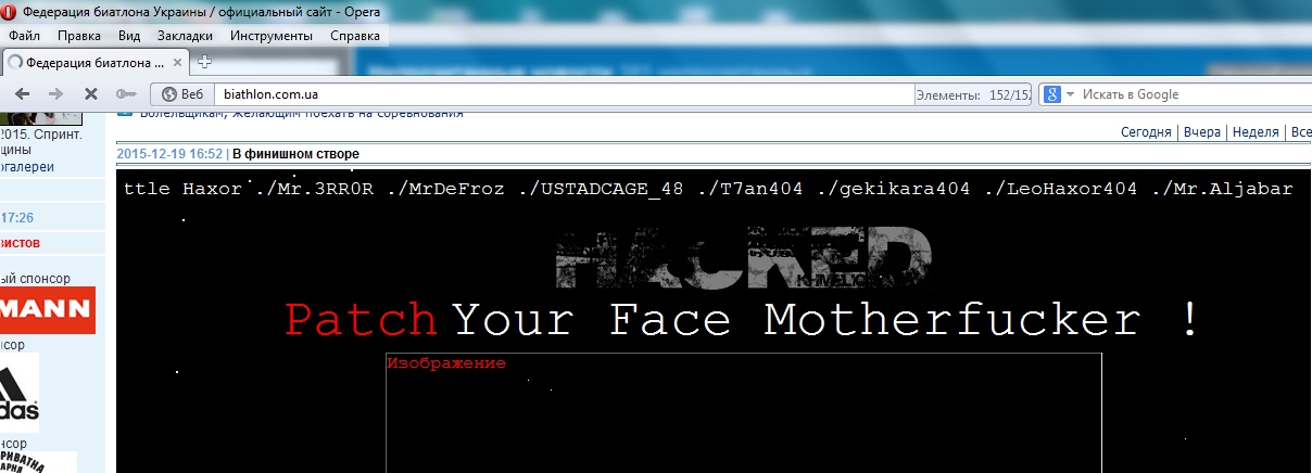 Официальный сайт Федерации биатлона Украины подвергся хакерской атаке. Злоумышленники взломали сайт и повесили на главной странице баннер «Hacked», сопровождаемый зловещей музыкой.