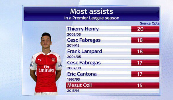 Собственно говоря, немецкий плеймейкер и французский форвард стали главными творцами победы «канониров». Месут Езил отметился двумя ассистами, имея на своем счету уже 15 голевых передач в этом сезоне. Любопытно, что только пяти игрокам в истории АПЛ удавалось сделать за сезон больше 15 голевых передач. До рекорда Месуту осталось не так много – всего 6 ассистов.