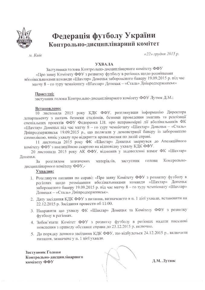 С подачи Вице-президента ФФУ, 10 ноября Комитет ФФУ по развитию футбола в регионах направил требование в КДК ФФУ разобраться с этим эпизодом. КДК открыл дело против ФК «Шахтер», несмотря на то, что сроки для привлечения к ответственности уже прошли (30 дней с момента, когда стало известно о нарушении, см. ст.39 ДП ФФУ). На следующий день Шахтер обжаловал открытие производства в Апелляционный комитет ФФУ, но Апелляция была отклонена и дело снова отправилось в КДК для рассмотрения, теперь уже по сути.