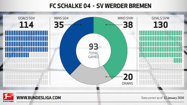 В первом круге «Шальке» без труда добыл три очка в Бремене, отправив в ворота хозяев три безответных гола. Однако в первой части чемпионата «плуты» забили всего 23 гола, что является худшим показателем результативности за последние 10 лет. «Шальке» не проигрывает в играх с «Вердером» 11 последних встреч, выиграв 8 из них. «Вердер» в чемпионате не может выиграть вот уже на протяжении 5-ти матчей кряду, проиграв 3 из них с общим счетом 2:11. Последняя победа команды Скрипника датирована ноябрем 2015-го года над «Аугсбургом».