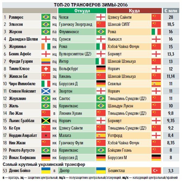 Так, вице-чемпион Китая «Шанхай SIPG» (спонсируемый Шанхайским портом – крупнейшим и самым загруженным в мире) за 18,5 млн евро перекупил у «Гуанчжоу» бразильца Элкесона, наколотившего за три сезона 77 голов. Дебютант китайской Суперлиги «Хэбэй Чайна Форчун», финансируемый компанией Chine Fortune Land (торговля недвижимостью и стройматериалами), выложил 15 млн за ивуарийского вингера «Ромы» Жервиньо. Но всех переплюнул обыгранный динамовцами на сборе в Испании «Цзянсу Сайнти». Клуб, хозяином которого является полуторатысячная сеть магазинов бытовой и электротехники, не стал унывать после срыва перехода Луиса Адриано и отстегнул вчера рекордные для нынешнего «окна» 28 млн евро Роману Абрамовичу за другого бразильца – полузащитника «Челси» Рамиреса. Впрочем, если эти персонажи еще тянут на роль звезд, то логику владельцев «Шанхай Шеньхуа» (Greenland Holding Group – еще один монстр на рынке недвижимости в Поднебесной) понять сложно: 11,1 млн евро – за 25-летнего хавбека «Хинаня» Жинхао Би, сыгравшего всего лишь один матч за сборную Китая! А «Тяньцзинь» из второго дивизиона за голкипера Лу Чанга заплатил почти 10 млн евро. Это в три раза дороже, чем обошелся «Бешикташу» Денис Бойко! Все из-за того, что вратарями в китайских командах могут быть только местные: легионеры на этой позиции – под запретом.