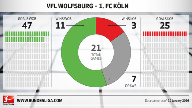 «Козлы» добыли победу лишь в одном из последних восьми своих матчей против «Вольфсбурга», а случилось это как раз в логове «волков» в январе 2010-го года. Нынешняя безвыигрышная серия «Вольфсбурга» насчитывает 5 матчей, что является худшим показателем за все время работы Дитера Хекинга в команде. По сравнению с прошлым сезоном «волки» набрали за пройденный этап чемпионата на 11 очков меньше, которые бы могли вывести их сейчас на 3-е место в Бундеслиге. «Кельн» проиграл всего одну игру из последних пяти, случилось это в матче против «Баварии».