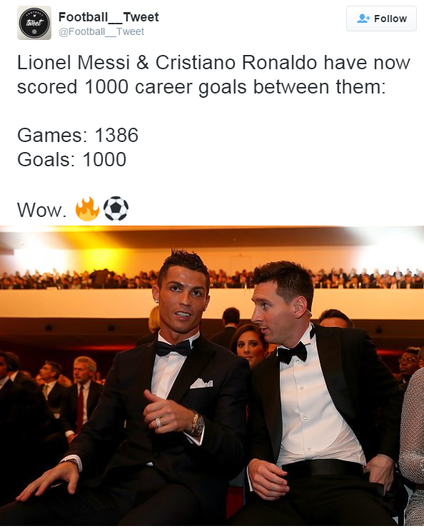 Нападающие «Барселоны» и «Реала» Лионель Месси и Криштиану Роналду в сумме забили 1000 мячей за карьеру. Месси в 613 матчах за «Барселону» и сборную Аргентины забил 482 гола. На счету Криштиану в 773 играх за «Спортинг», «Манчестер Юнайтед», «Реал Мадрид» и сборную Португалии 518 мячей.