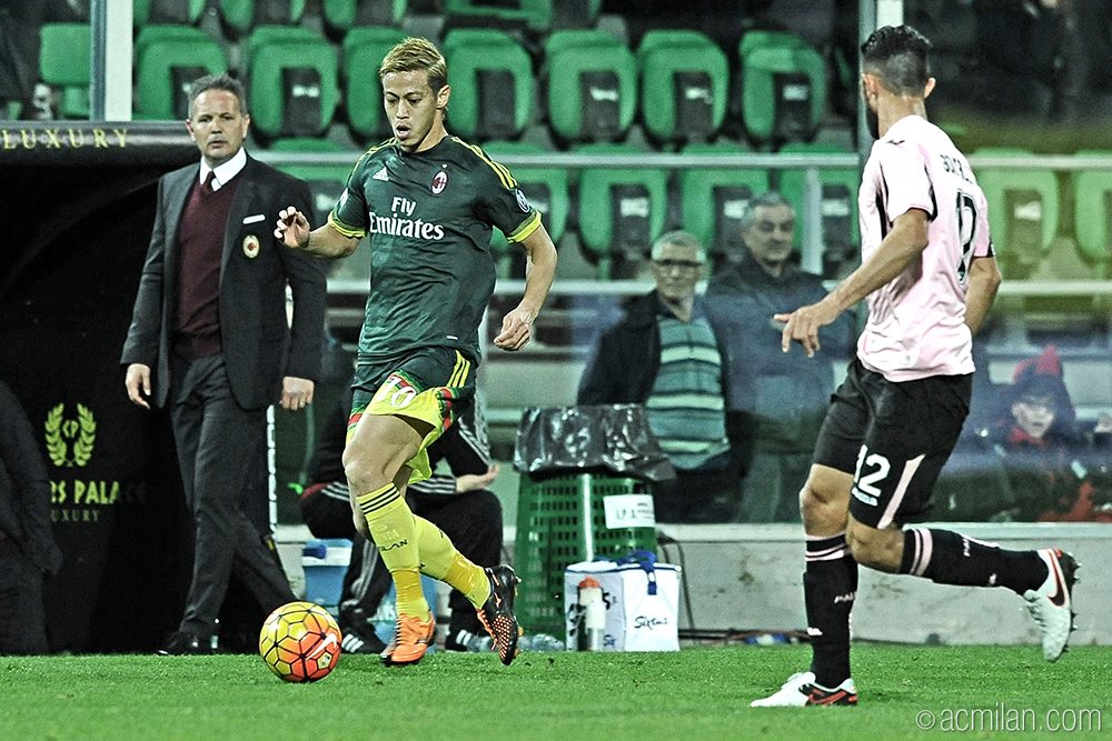 Начало противостояния чётко продемонстрировало, что гости намерены продлить свою победную серию. «Милан» играл мощно, на кураже, не замечая никаких препятствий на пути к достижению цели. Уже на пятой минуте Ньянг пробил по воротам «Палермо» с линии штрафной, сицилийские защитники бросились под удар и тем самым спасли свою команду от неприятностей. Буквально сразу же Бонавентура выполнил подачу во вратарскую, Соррентино кулаками отбил мяч не очень удачно, но и удар у Монтоливо толком не получился. Между тем, моменты продолжали возникать, причём у ворот исключительно одной из команд. Хонда с углового закрутил мяч в ство, Соррентино кулаками отбил мяч, на подборе первым был Куцка, который также пробил в ближний угол ворот, Соррентино не стал рисковать и перевел мяч на угловой. Несколько минут спустя всё тот же активный японец выполнил заброс на линию вратарской, мяч юркнул перед Соррентино, но голкипер успел сложиться и ногой отбить мяч, а после ему помогли защитники. «Россонери» могли даже на пенальти за игру рукой претендовать, вот только рефери был иной точки зрения.
