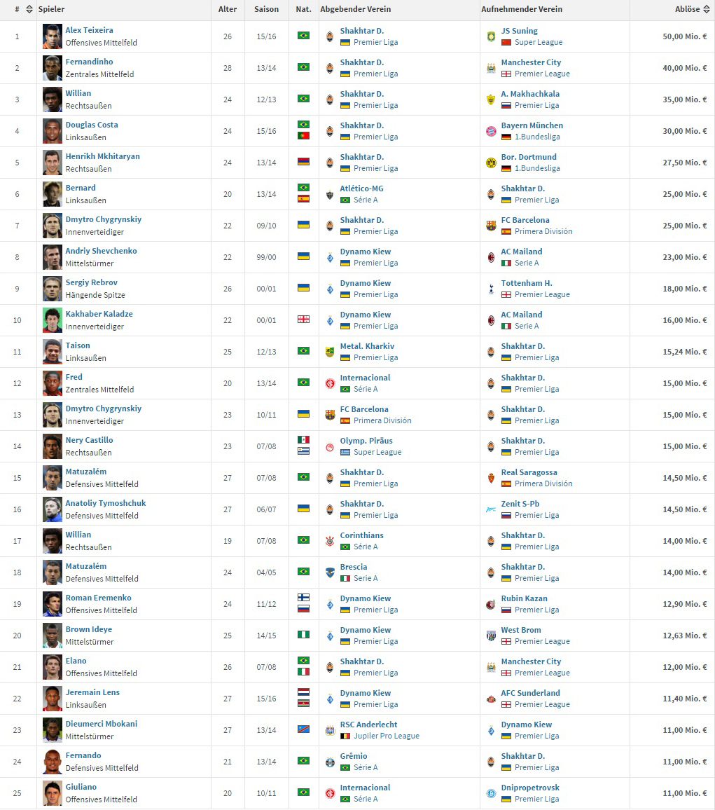 Трансфер Алекса Тейшейры в «Цзянсу Сунин» за 50 миллионов евро надолго забронировал за собой первую строчку в списке ТОП-трансферов Украины, побив рекорд Фернандиньо, перешедшего в сезоне 2013/14 в «Манчестер Сити» за компенсацию в размере 40 миллионов евро.