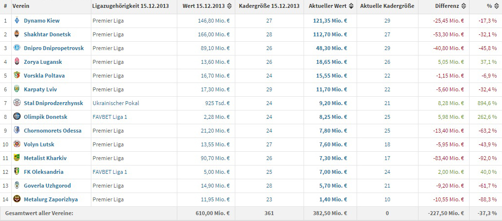 Суммарная стоимость всех игроков украинской Премьер-лиги на сегодняшний день составляет 382 миллиона евро, что почти в два раза меньше той же суммы, которая была в конце 2013-го года, когда в нашей стране усложнилась политическая ситуация. К тому моменту украинские клубы имели в своем распоряжении футболистов на общую сумму в 610 миллионов евро по оценкам авторитетного издания Тransfermarkt.de.