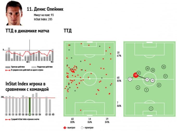 Диаграммы действий Олейника в матче против «Херенвена». Обращает на себя внимание относительно низкая усредненная позиция на поле и большой объем работы в его средней части. Номинально занимая позицию флангового нападающего, Олейник много взаимодействует с центральными полузащитниками на начальных стадиях комбинаций.