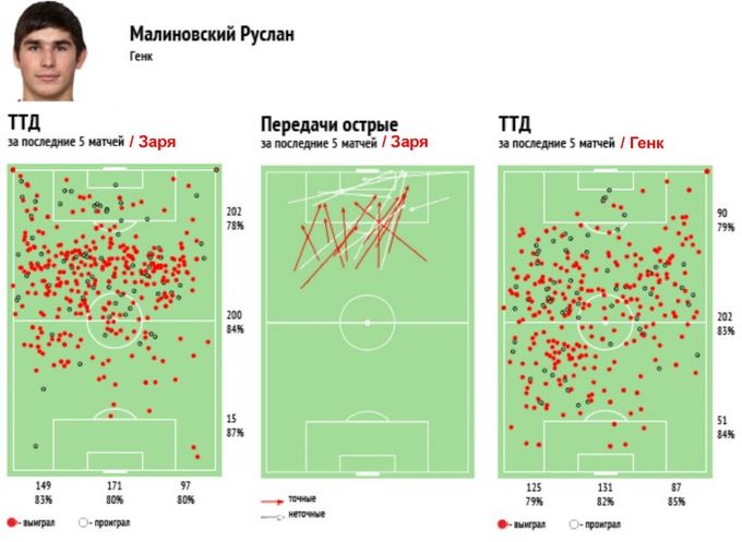 Диаграммы ТТД и острых передач Малиновского в 5 последних играх в составе «Зари» (слева) и ТТД в 5 матчах за «Генк» (справа). Центр действий игрока сейчас перенесен в глубину поля.