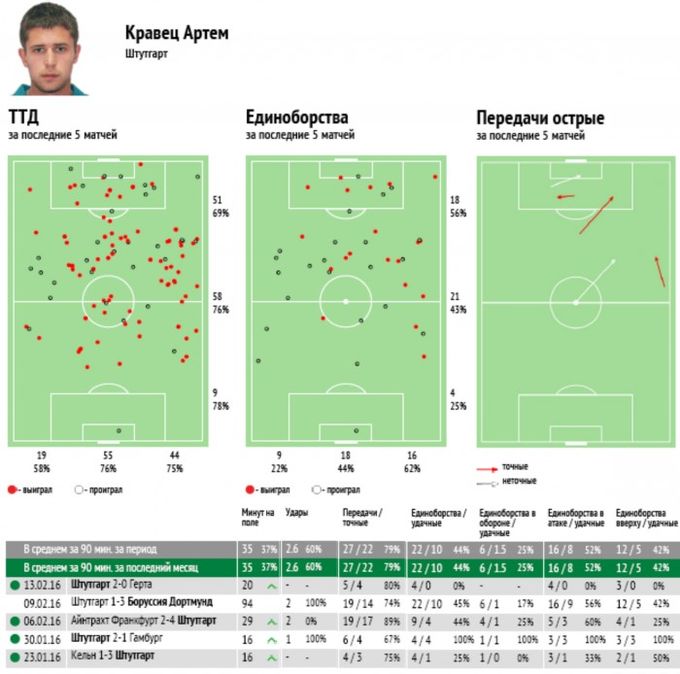 Диаграммы ТТД и показатели Кравца в матчах за «Штуттгарт». Область действий в схеме 4-4-2 широка и не ограничивающаяся номинальными функциями форварда. Об этом же говорит и заметный для этой позиции объем борьбы в обороне.