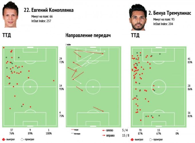Диаграмма ТТД и передач, выполненных за 66 минут на поле Коноплянки. Справа для сравнения объем ТТД Тремулинаса (сыграл полный матч). В переводе на время объем ТТД, выполненных в верхней трети поля одинаков, а вот конструктивных передач по данным InStat Football Тремулинас выполнил почти втрое больше (42 против 16).