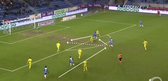 80-я минута игры с «Бевереном». Малиновский (с мячом) получил передачу в зону дуги и пытается отсюда прорваться в штрафную соперника через игру в касание с нападающим.