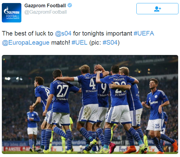 17:24. Титульный спонсор немецкого клуба, «Газпром», желает удачи «Шальке»: