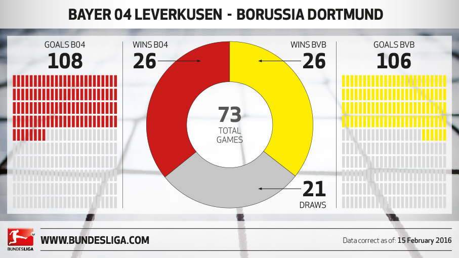 Не в пользу «Байера» говорит статистика домашних матчей против Дортмунда - в последних 8-ми из них «аптекари» не знают радости побед, что является худшим показателем для этой команды в поединках среди всех участников Бундеслиги. Последняя победа Леверкузена на «БайАрене» над «Боруссией» приходится на май 2007-го года, когда Штефан Кисслинг и Симон Рольфс помогли своей команде добыть победу с минимальным преимуществом - 2:1. Тогда «Байером» управлял Михаэль Скиббе, а «Боруссию» тренировал Томас Долль. В нынешнем сезоне Дортмунд уже заработал больше очков, чем за весь прошлый - 48 против 46. «Байер» не знает горечи поражения на протяжении 6-ти последних матчей, а Шмидт набрал в этих матчах 14 из возможных 18-ти очков. Дортмунд выиграл все 17 матчей, в которых забивал Генрих Мхитарян, поэтому одной из главных задач хозяев будет закрыть армянского хавбека.