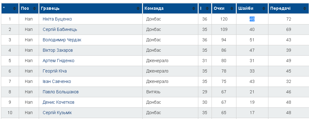 Также сразу четыре игрока «Донбасса» лидируют зачете бомбардиров. На первой строчке с 120 (48+72) очками идет Никита Буценко, на втором месте расположился Сергей Бабинец, у которого в активе 109 (40+69) очков. Тройку замыкает Владимир Чердак с 94 (51+43) баллами за результативность.