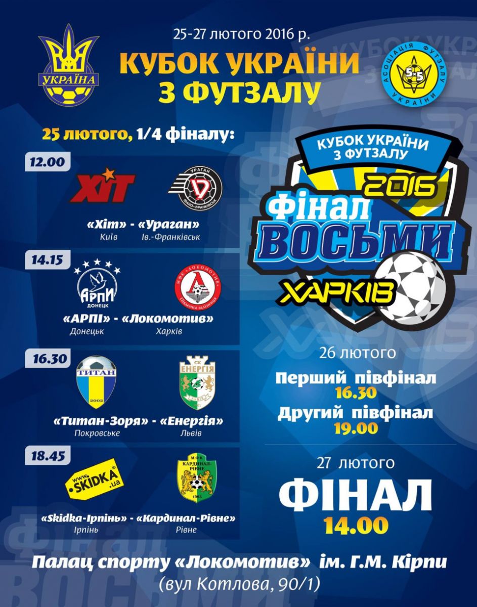 Начиная с четверга, 25 февраля, и в два последующих дня отечественный футзал будет сверхнасыщен интересными событиями, которые будут происходить в харьковском Дворце спорта «Локомотив». За это время будут сыграны сразу 7 матчей, которые назовут обладателя Кубка Украины сезона 2015/2016 годов. Напомним, что после вылета еще на стадии 1/16 финала сенсации прошлогоднего розыгрыша, киевской команды «Manzana», почетный трофей на данный момент является вакантным, что еще больше подогревает интерес к предстоящим матчам.
