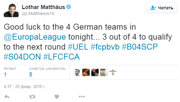 14:47. Лотар Маттеус желает удачи всем четырем немецким командам, которые играют сегодня вечером: