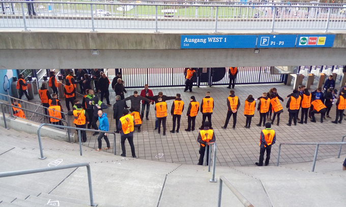 17:57. Стоянка возле «Арены АуфШальке» постепенно заполняется: