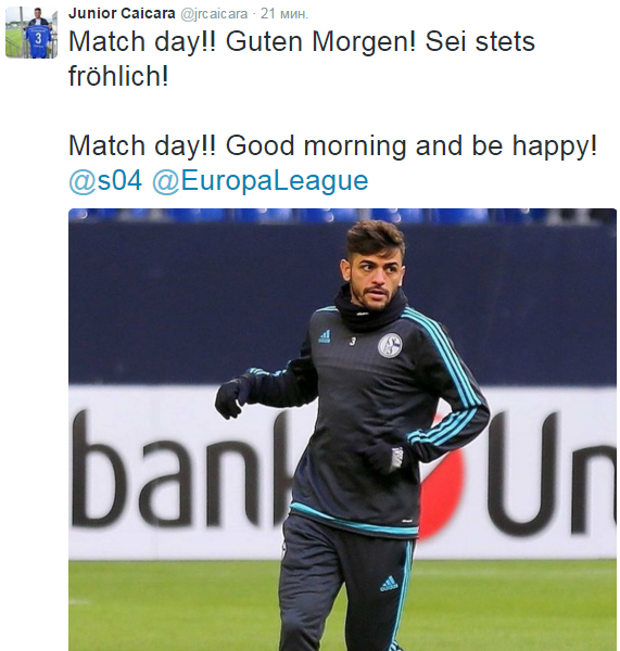 13:03. Бразильский защитник немецкой команды Жуниор Кайсара всем желает доброго утра и напоминает, что сегодня - большой футбол:
