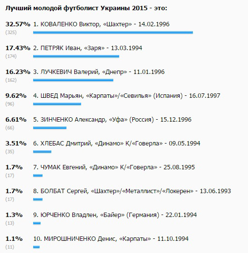 За звание Лучшего молодого футболиста 2015-го года на равных сражались сразу двое вундеркиндов - Иван Петряк и Виктор Коваленко. Однако за счет голосов украинских болельщиков, а также редакции Sport.ua, именно хавбек донецкого «Шахтера» Виктор Коваленко смог на считанные баллы опередить игрока луганской «Зари» Петряка и завоевать почетное звание! На третьем месте финишировал полузащитник российской «Уфы» Александр Зинченко.