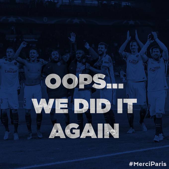 Парижане не отказали себе в удовольствии пошутить над поверженным соперником. В официальном профиле ПСЖ в Instagram появилась картинка с надписью «Ой… Мы сделали это снова», которая намекает на то, что в прошлом сезоне Лиги чемпионов ПСЖ тоже праздновал победу над «Челси». Тогда парижане сыграли 1:1 дома и 2:2 в гостях, выйдя в четвертьфинал благодаря голу на выезде. Правда, там ПСЖ уступил «Барселоне» с общим счетом 1:5…
