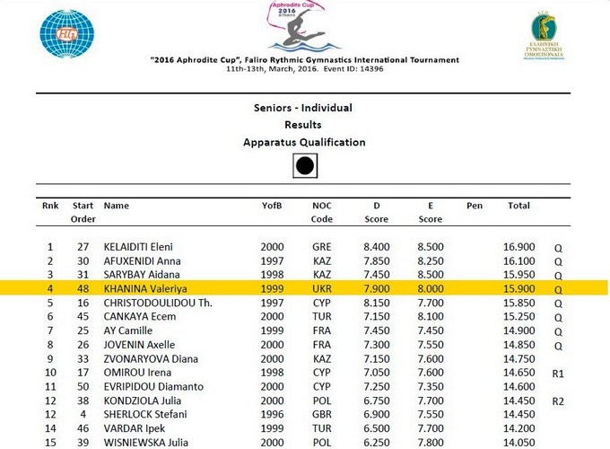 Среди сеньорок Украину представляла финалистка Юношеских Олимпийских игр Валерия Ханина. Лера уверенно прошла упражнение с обручем и не менее уверенно упражнение с мячом, хотя и допустила в последнем небольшую потерю. В финал с обручем Лера прошла с 3 квалификационным результатом, в финал с мячом — с 4. После двух видов по многоборью Лера идет на 4 месте.