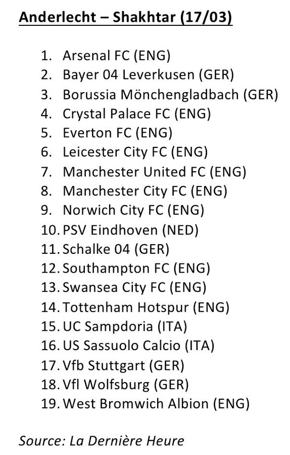 «Андерлехт»: 1. Прото (к), 7. Нахар, 4. Мбоджи, 14. Нейтинк, 3. Дешахт, 8. Баджи, 16. Дефур, 10. Прат, 18. Ашампонг, 93. Эзекиль, 99. Окака