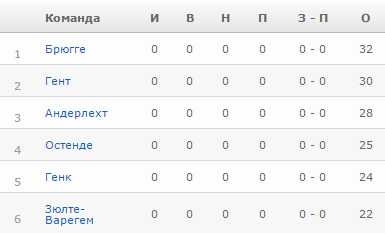 18:22. Напомним, что чемпионат Бельгии разыгрывается в два этапа. На первом каждая из команд проводит по 30 матчей. После этого 6 лучших команд разыгрывают звание чемпиона в двухкруговом турнире с учетом половины набранных в чемпионате очков. Восемь клубов, занявших на первом этапе места с 7-го по 14-е, делятся на две группы, в рамках которых также сыграют между собой двухкруговой турнир. При этом очки, набранные командами на первом этапе, не учитываются. Победители групп сыграют между собой и победитель этого плей-офф, в свою очередь, сыграет с командой, занявшей 5-е место в турнире за чемпионское звание. Победитель этой пары получит путёвку от Бельгии в Лигу Европы. Две команды, занявшие по итогам первого этапа последние места, разыграют во встречах между собой право остаться в Лиге Жюпиле в следующем сезоне. При этом команда, занявшая в регулярном турнире 15-е место, начнёт плей-офф с тремя очками.