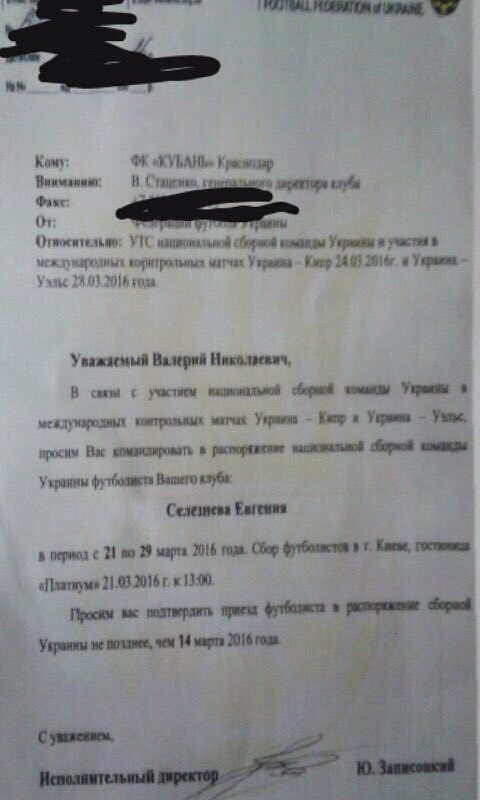 Спортивный директор «Кубани» Сергей Доронченко опубликовал фото официального вызова нападающего Евгения Селезнева в сборную Украины на ближайшие товарищеские матчи с Кипром и Уэльсом.