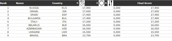 В обед выступали групповички. К сожалению, команде Украины в групповых упражнениях не удалось пройти свою программу чисто, результат девушек — 15,550 (8 место). Хотя оценка не высока, девушки прошли в финал в этом виде.