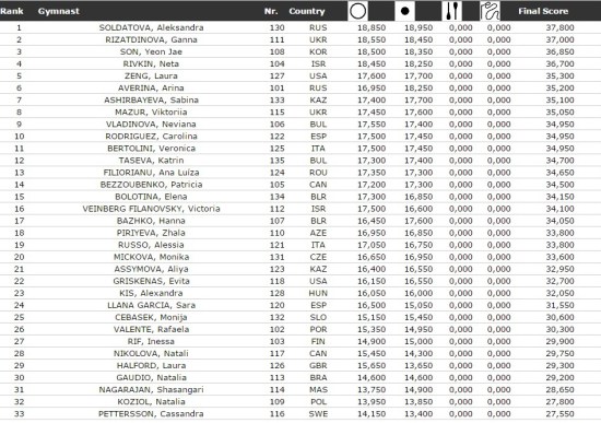 Гимнастки-личницы делали упражнение с обручем и мячом, а групповички — с 5 лентами. Завтра личницы выступят с булавами и лентой, а групповички — с обручами и булавами, завтра же и определятся победители в многоборье. Многоборье является квалификацией в отдельные виды.