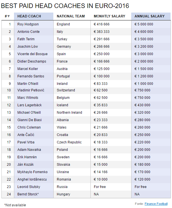 Самым высокооплачиваемым наставником оказался рулевой сборной Англии Рой Ходжсон, который получает 416 тысяч евро в месяц.