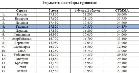 Сборная команды Украины в групповых упражнениях выступила прекрасно, но допустив пару мелких ошибок, также осталась в шаге от пьедестала и с отрывом в 0.05 заняла 4 место, но девочки прошли в оба финала: в финал с 5 лентами с 5 квалификационным результатом, в финал 3+2 с 3 квалификационным результатом.