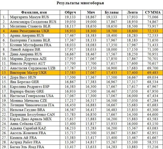 Первой соревнования начала Анна Ризатдинова и допустила досадную ошибку в обруче, что оставила ее в шаге от пьедестала. Анна собралась и блестяще выступила с тремя остальными видами. В итоге она заняла 4 место. Анна прошла в финал с мячом (4), булавами (2) и лентой (2). (*В скобках — квалификационный результат.)
