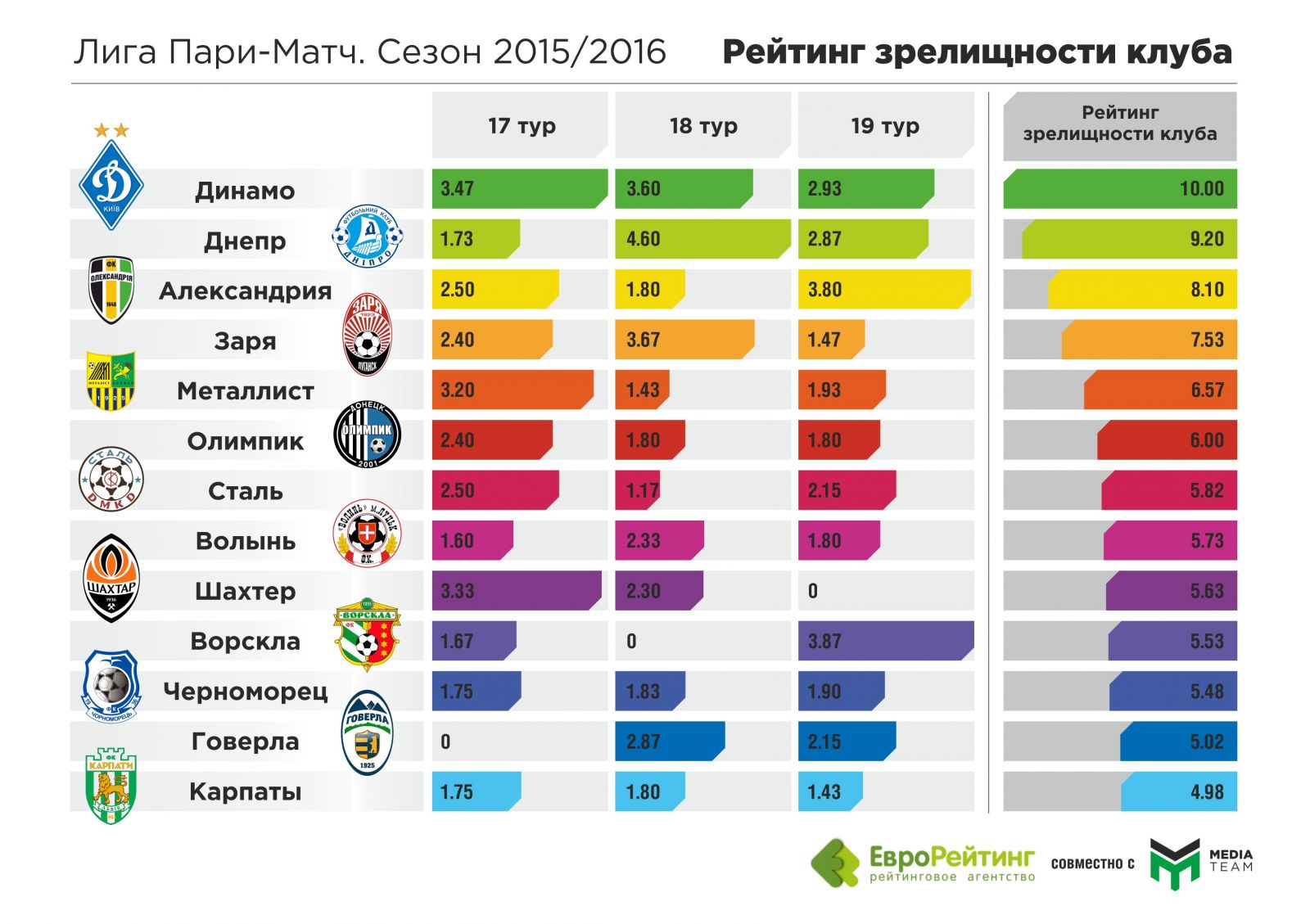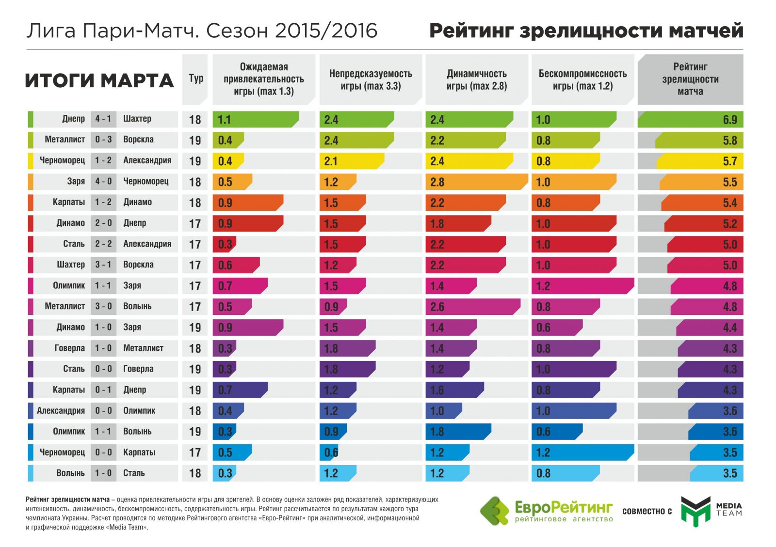 Рейтинг зрелищности матча – оценка привлекательности игры для зрителей. В основу оценки заложен ряд показателей, характеризующих интенсивность, динамичность, бескомпромиссность, содержательность игры. Рейтинг рассчитывается по результатам каждого тура чемпионата Украины. Расчет проводится по методике Рейтингового агентства «Евро-Рейтинг» при аналитической, информационной и графической поддержке «Media Team».