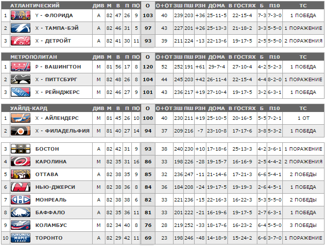 Вашингтон, Питтсбург, Флорида, Рейнджерс, Айлендерс, Тампа-Бэй, Детройт, Филадельфия.