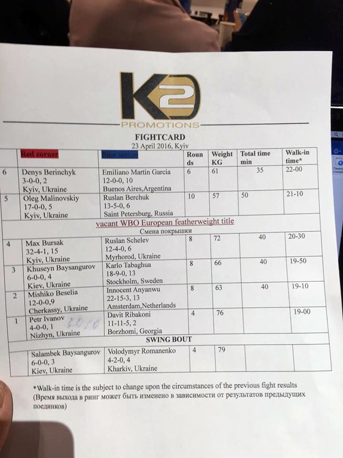 Вечер бокса в киевском Дворце Спорта, организованный промоутерской компанией Александра Красюка K2 Promotion Ukraine, открыл восьмираундовый поединок в первом полусреднем весе между черкасским боксером Мишико Беселия (12-0, 9 КО) и представителем нидерландской школы бокса, выходцем из Камеруна, Инноцентом Ануанву (22-15-3, 13 КО).