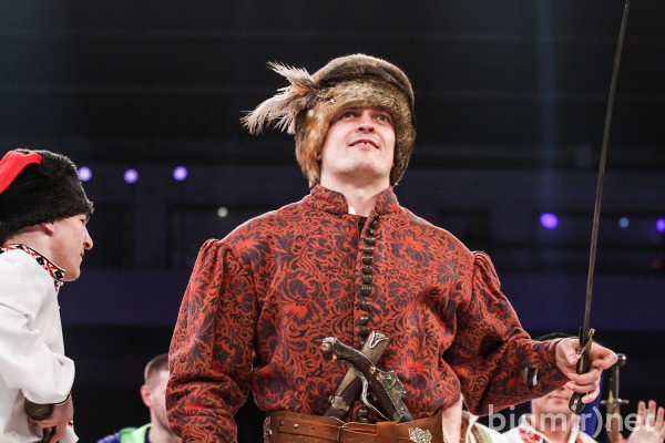Выход в ринг команды Беринчика был чертовски красочным. Усик в образе гетмана и Денис в вышиванке и шароварах смотрелся весьма эффектно. Шоу выхода было супер.