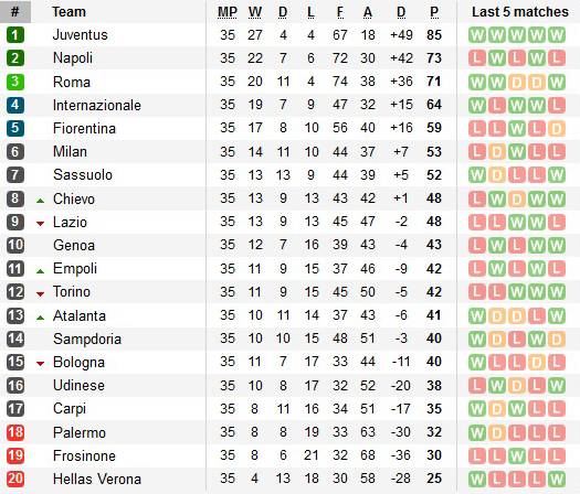 На последних минутах «адзурри» могли отодвинуть чемпионство «Ювентуса», но Гамшик из выгодного положения пробил мимо пустых ворот под прессингом Рюдигера. А уже за минуту до конца основного времени Найнгголан смачным ударом поразил правый нижний угол с 15 метров и установил окончательный результат. Финальный свисток официально признал пятое подряд и 32 (34) чемпионство за всю историю «Ювентуса».
