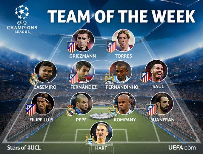 В Команду недели по итогам первых матчей 1/2 финала Лиги чемпионов попали сразу шесть игроков «Атлетико». Остальные футболисты представляют «Реал» и «Манчестер Сити».