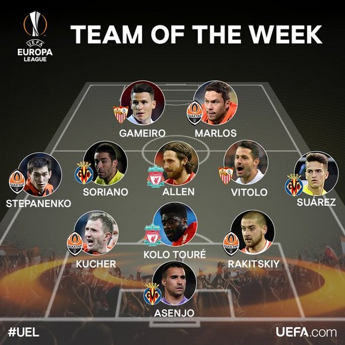 Официальный сайт УЕФА опубликовал свою версию сборной недели Лиги Европы. В символическую команду по итогам первых полуфинальных матчей попали четыре игрока «Шахтера» – Ярослав Ракицкий, Александр Кучер, Тарас Степаненко и Марлос. Стоит отметить, что у трех футболистов из этой четверки украинские паспорта.