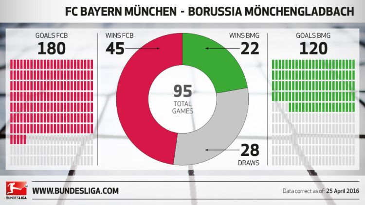 Игра на «Альянц Арене» будет архиважной для Гладбаха, который сохраняет отличные шансы на попадание в зону Лиги чемпионов. Для выхода на четвертую строчку в чемпионате команду Андре Шуберта устроит даже ничья в Мюнхене при поражении в параллельном матче «Герты». Учитывая тот факт, что на отчетный поединок Гвардиола наверняка выставит не самый основной состав в виду ответной игры с «Атлетико» на неделе, «Боруссия» имеет все шансы показать хороший футбол на «Альянц Арене» и попробовать зацепиться за очки. Тем временем, «Бавария» не опускается с первого места в чемпионате с 6-го тура, когда разгромила на своем поле «Вольфсбург» 5:1 благодаря пента-трику Роберта Левандовски. С сезона 1999/2000 «Бавария» не может оформить чемпионский титул в родных стенах и теперь у них есть прекрасная возможность отметить это событие на своем стадионе.