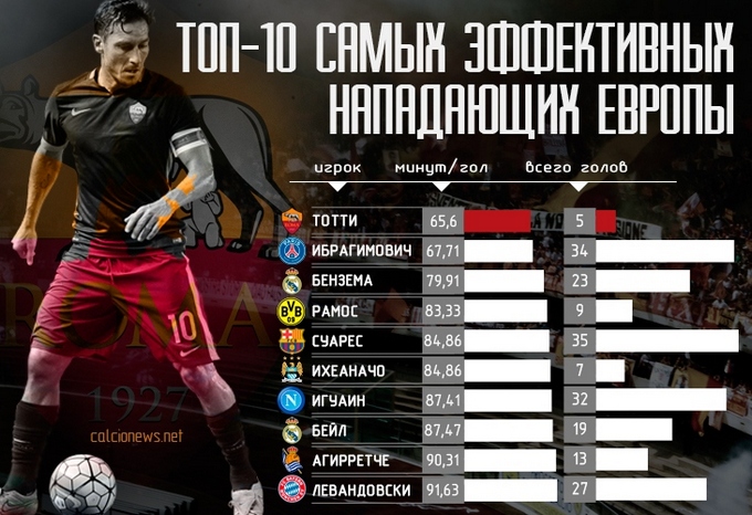 В свои 39 капитан «Ромы» Франческо Тотти не перестает удивлять футбольную общественность – отличившись пять раз в сезоне, форвард «джаллоросси» имеет лучшие показатели средней результативности в чемпионатах большой пятерки.
