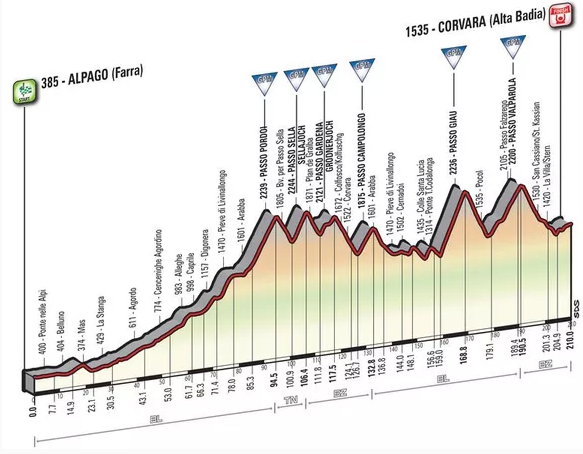 Первый из трех этапов, которые получили пять звезд. Если только позволит погода, нас ждет зрелище для самых стойких. В программе двухтысячныки Passo Pordoi (9,3 км протяжённости, 7,8% средний градиент, 9% максимальный градиент), Passo Sella / Sellajoch (5,5 км, 8%, 12%), Passo Gardena (5,8 км, 4,4%, 9%), Passo Giau (9,8 км, 9,4%, 14%) и Passo Valparola (11,5 км, 5,8%, 14%).