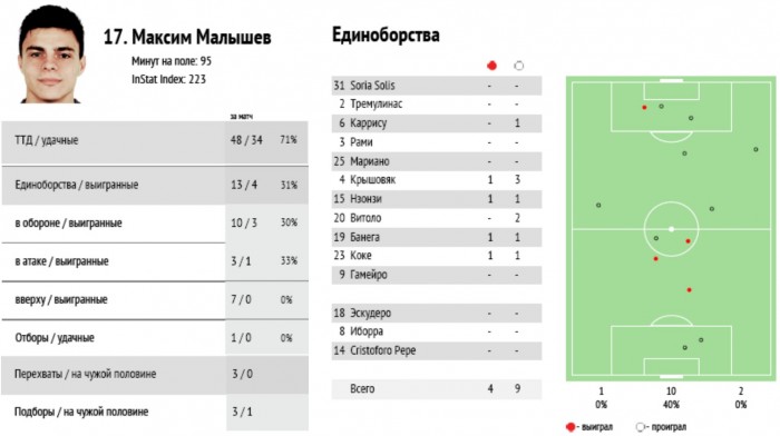 В послематчевых обсуждениях как болельщики, так и специалисты часто сталкиваются с соблазном назначить виновных за те или иные просчеты, приведшие к неудачам в игре. Однако в данном случае нельзя не отметить соответствие итоговых статистических показателей Малышева как игрока опорной зоны с его действиями в результативных атаках соперников. Футболист, занимающий ключевую позицию в обороне центральной линии, не может действовать столь неэффективно и пассивно. Например, Степаненко наряду с гораздо большим объемом работы в созидании (29 конструктивных передач) выиграл 50% борьбы и 7 раз вступал в отбор.