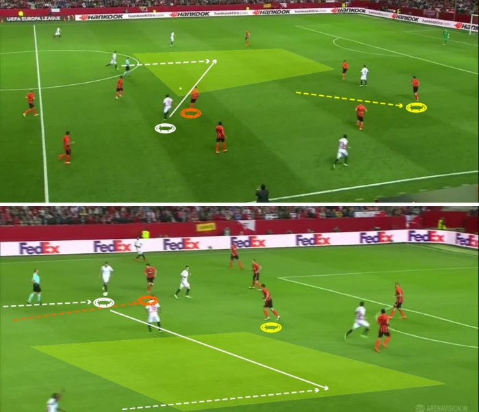Вторая голевая атака «Севильи» (вверху). Малышев (красный) позволяет Банеге (белый) выполнить передачу на ход Крыховяку. Степаненко (желтый) отошел для совместной с Ракицким страховки зоны Исмаили, задержавшегося в атаке. В третьей голевой комбинации хозяев (внизу) Малышев лишь сопровождает Витоло и позволяет ему беспрепятственно выполнить нацеленную передачу. В обоих случаях со стороны Малышева отсутствуют даже попытки выпада в отбор.