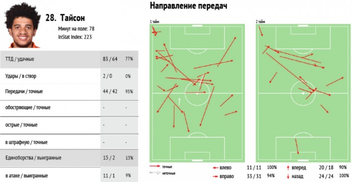 После первого полуфинального матча критики Луческу удостоился Тайсон, не сыгравший, по его словам, во Львове «и на половину своих возможностей». Отчасти это относится и к ответному поединку. Однако основная заслуга в этом принадлежит соперникам. Как креативный игрок атаки, в Севилье Тайсон справлялся с возложенными на него обязанностями. По данным InStat Football, на его счету 44 передачи, выполненных с точностью 95% – более чем достойный показатель. Причем эффективность его передач, направленных вперед, составила 90%.