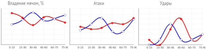 Динамика изменения владения мячом, числа атак и ударов на отрезках игры по 15 минут. Красные – хозяева, синие – гости.