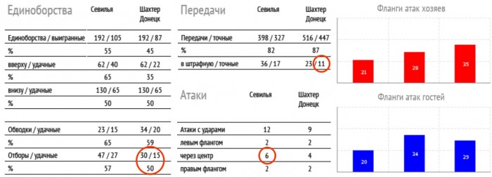 Основной успех в единоборствах испанцев заключался в превосходстве в игре в воздухе и качестве отборов. Малое число передач в штрафную «Севильи» стало причиной лишь двух ударов из ее пределов. При акценте «Севильи» в атаках через правый фланг, наиболее эффективными (6 ударов) стали ее комбинации через центр. Это также соответствует проблемам «горняков» в опорной зоне.
